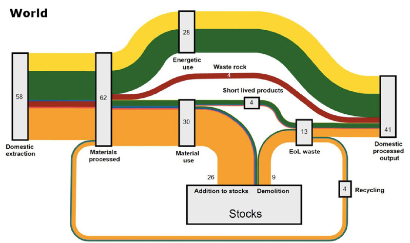 Circular Economy (and Global Material and Waste Flows), Part IIIWhere does everything go? The last posting on the circular economy (CE) was back in August 2014 and discussed how to measure progress and the role of big data. The focus was on more sustainable behavior and how we might encourage consumers to consider sustainable products. In that context manufacturing needed to increase the yield (efficiency of conversion of materials in to products) in a number of processing operations by identifying “insights” into production that were overlooked due to complexity of the process, large numbers of variables, many differing process stages, etc. And the use of “big data” was one solution. The circular economy idea, as introduced in part 1 of the posting on the subject strives to convert our current “linear economy” (paraphrased as “take, make, dispose) where we convert resources into products, use them until they wear out, break or become out of style, and then discard them, to a circular economy. According to a recent EU report, a linear economy is one wherein systems retain the added value in products for as long as possible and eliminate waste. In addition, resources are kept within the economy when a product has reached the end of its life so that the product can be productively used again and again and hence create further value. (Source: “Towards a circular economy: A zero waste programme for Europe,” Communication from the Commission to the European Parliament, The Council, The European Economic and Social Committee and the Committee of the Regions, COM(2014) 398). If we think of our planet as a closed system (sort of like a space station floating in the ether) then nothing is really created beyond what we have already and nothing really disappears as there is “no where for it to go!” So if we look at the extraction of minerals and other raw materials, their conversion into products and use, and then their end of life (usually disposal), the “circularity” relates to the reuse of materials and resources so that we keep within the limits of their availability for all time. Once materials are extracted from the environment and subsequently converted into something our “system” (referred to below as the socioeconomic system (SES)) uses them or stores them and eventually outputs or disposes of them. In one sense circularity measures the degree to which once materials are used they find their way back into the system for productive use. This is complicated. Some materials, as in buildings, stay “in the system” for a long time before being expelled. Others, like cell phones, may be substantially shorter lived. Within the system we can recover and reuse, or extend the life of, products containing these materials and, hence, enhance circularity. Or we can expel them as waste. The objective in this posting is to explore what our current state of circularity is with respect to materials. First, it is beneficial to dig a bit deeper into what circularity is in terms of the circular economy. Perhaps the best information on what is, and is not, included in the circular economy, is from the Ellen MacArthur Foundation. They have a number of reports with some based on McKinsey and Company analysis done of the foundation — check their website for info. In one recent publication, A New Dynamic: Effective Business in a Circular Economy (Ellen MacArthur Foundation, 2013) they outline some 15 characteristics differentiating a linear from a circular economy. Some examples from this publication include: